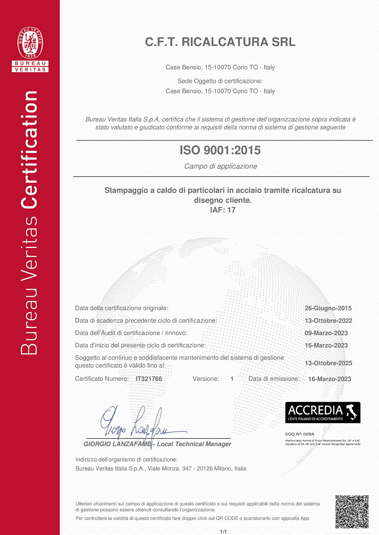 Das Hauptziel von CFT srl ist es, die Qualitat seiner Geschaftsprozesse und Produkte kontinuierlich zu verbessern, um die "Kundenzufriedenheit" zu erreichen und standig zu steigern. Um diese Richtlinie umzusetzen und die gesetzten Ziele zu erreichen, hat das Unternehmen die Norm UNI EN ISO 9001: 2015 als Referenzmodell fur sein Qualitatsmanagementsystem ubernommen.